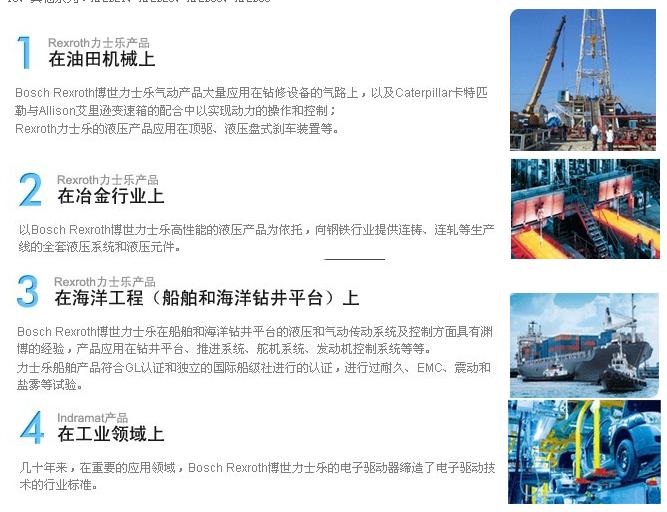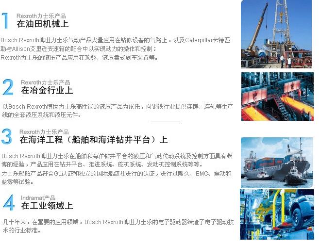 Bosch Rexroth为工业及工厂自动化、行走机械、以及可再生能源等领域的客户提供传动、控制与移动解决方案;作为全球超过50万客户的共同选择,力士乐正不断为客户提供高质量的电控、液压、气动以及机电一体化元件和系统。Bosch Rexroth力士乐气动产品大量应用在钻修设备的气路上,以及Caterpillar卡特匹勒与Allison艾里逊变速箱的配合中以实现动力的操作和控制。以Bosch Rexroth力士乐高性能的液压产品为依托,Rexroth向钢铁行业提供连铸、连轧等生产线的全套液压系统和液压元件。Bosch Rexroth力士乐在船舶和海洋钻井平台的液压和气动传动系统及控制方面具有渊博的经验,产品应用在钻井平台、推进系统、舵机系统、发动机控制系统。